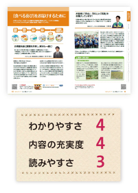 「『食べる喜び』をお届けするために」をテーマに特集。「お客様視点」で業務に励む営業マンの想いをはじめ、海外で働く従業員の声、海外グループ会社の品質面・環境面に対する取り組み、おすすめ商品の製造工程や商品に込められたこだわりなどを紹介している。